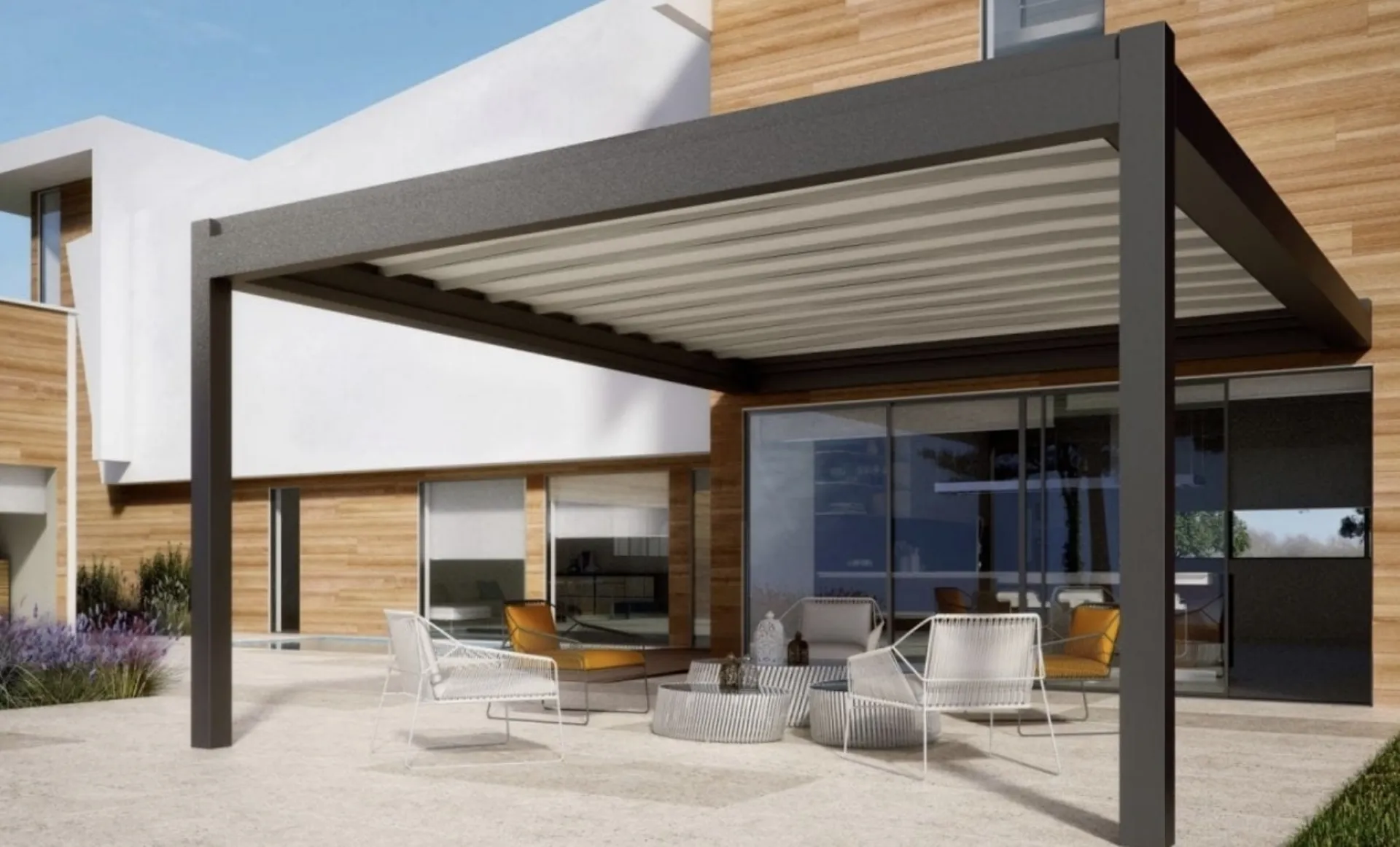 La Pergola Nomo di Pratic nell'immagine ti farà ricreare un confortevole living in giardino, coniugando grandi doti di praticità e design. Così come nei locali indoor, anche in giardino è possibile esprimere il proprio gusto in fatto di arredo, dando vita a composizioni arredative di grande fascino. Materiali di lunga durata e linee alla moda connotano tutte le Pergole firmate Pratic, sinonimo di qualità ed eccellenza. Divertiti a organizzare il tuo outdoor come fosse una stanza in più di casa, scopri da noi le Pergole a muro o freestanding dei migliori brand.